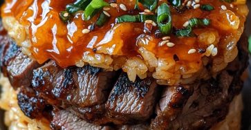 Layered Korean BBQ Beef Rice Stackwith Sweet Soy Glaze & Sesame Crunch🧾 Ingredients500 g thinly sliced beef (ribeye or sirloin)2…