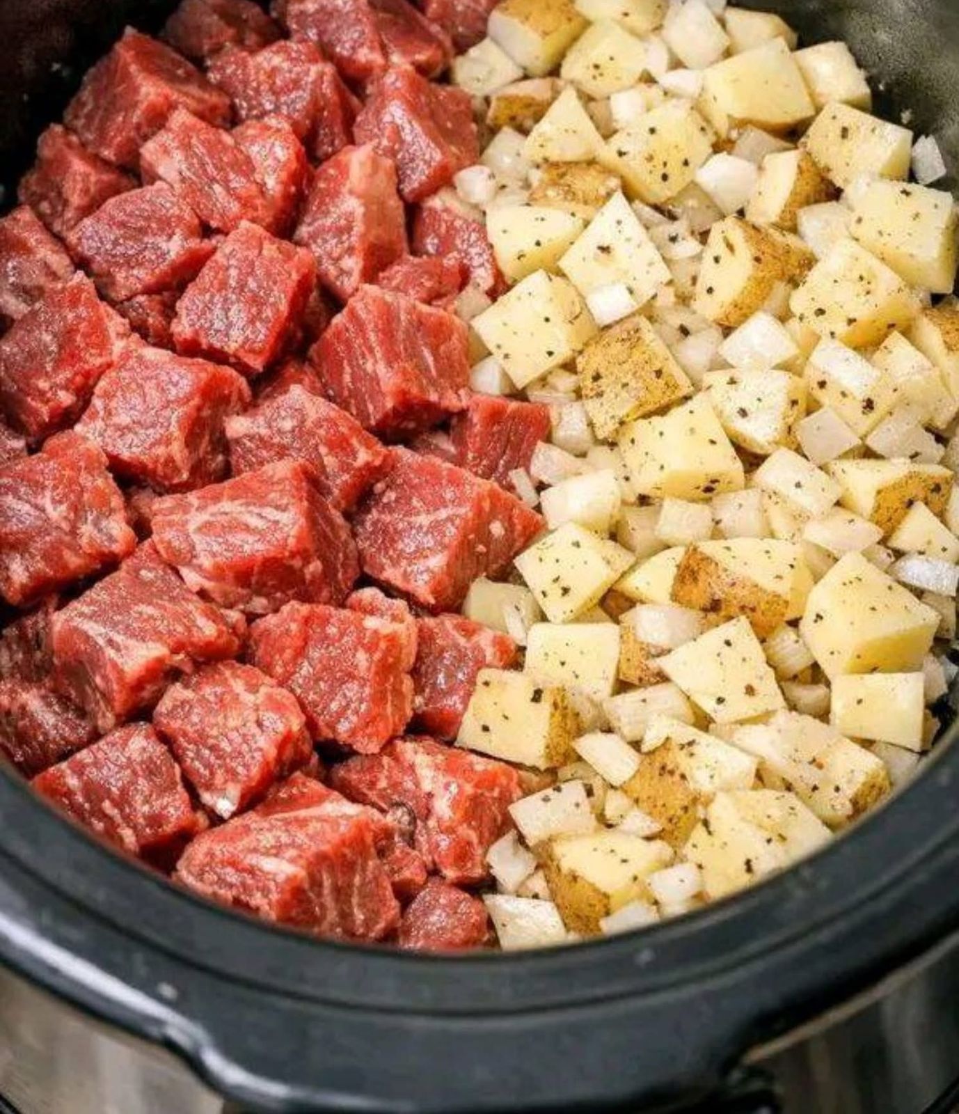 Place the raw beef cubes directly into the slow cooker.