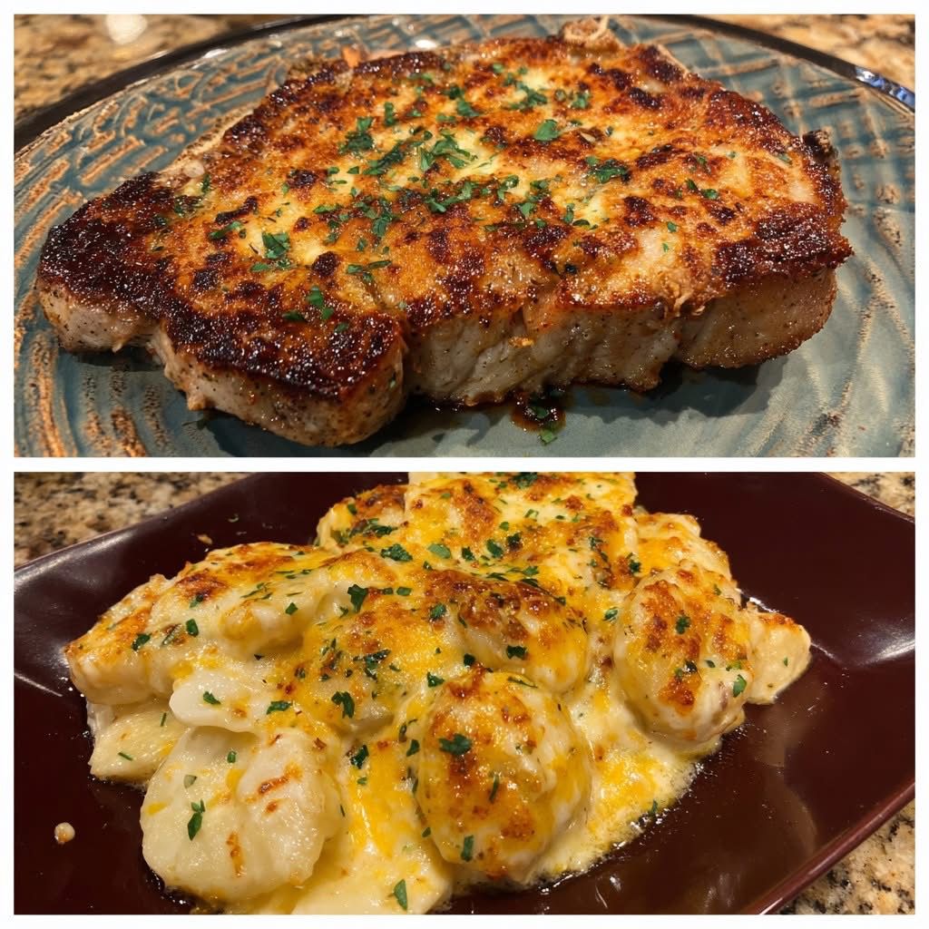 A hearty, comforting one-pan dinner with tender pork chops baked over creamy, cheesy scalloped potatoes. Perfect for Sunday supper!