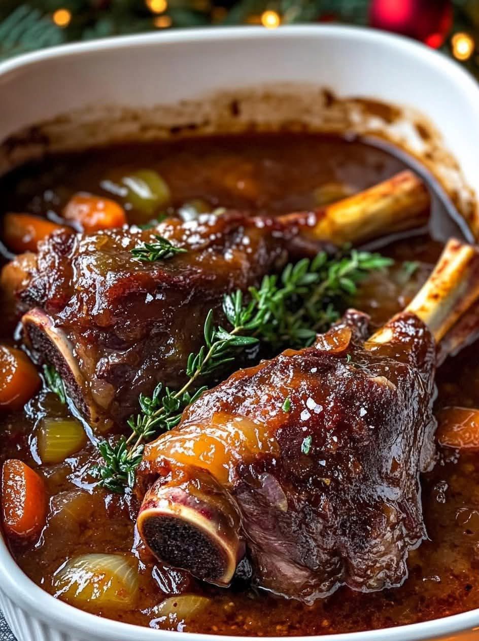 Fall-off-the-bone tender lamb shanks slowly braised in rich red wine with herbs and vegetables — pure comfort food.