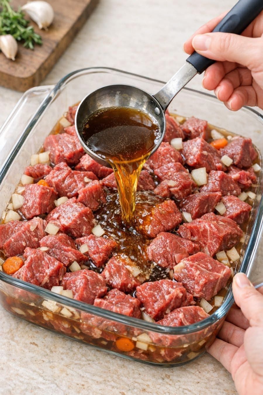 Place raw stew meat in a 9×13-inch glass casserole dish.