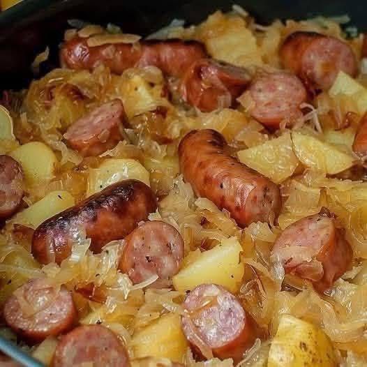 Hearty, rustic, and full of comforting flavor — smoky sausage, tangy sauerkraut, and tender potatoes all cooked together in one pan.