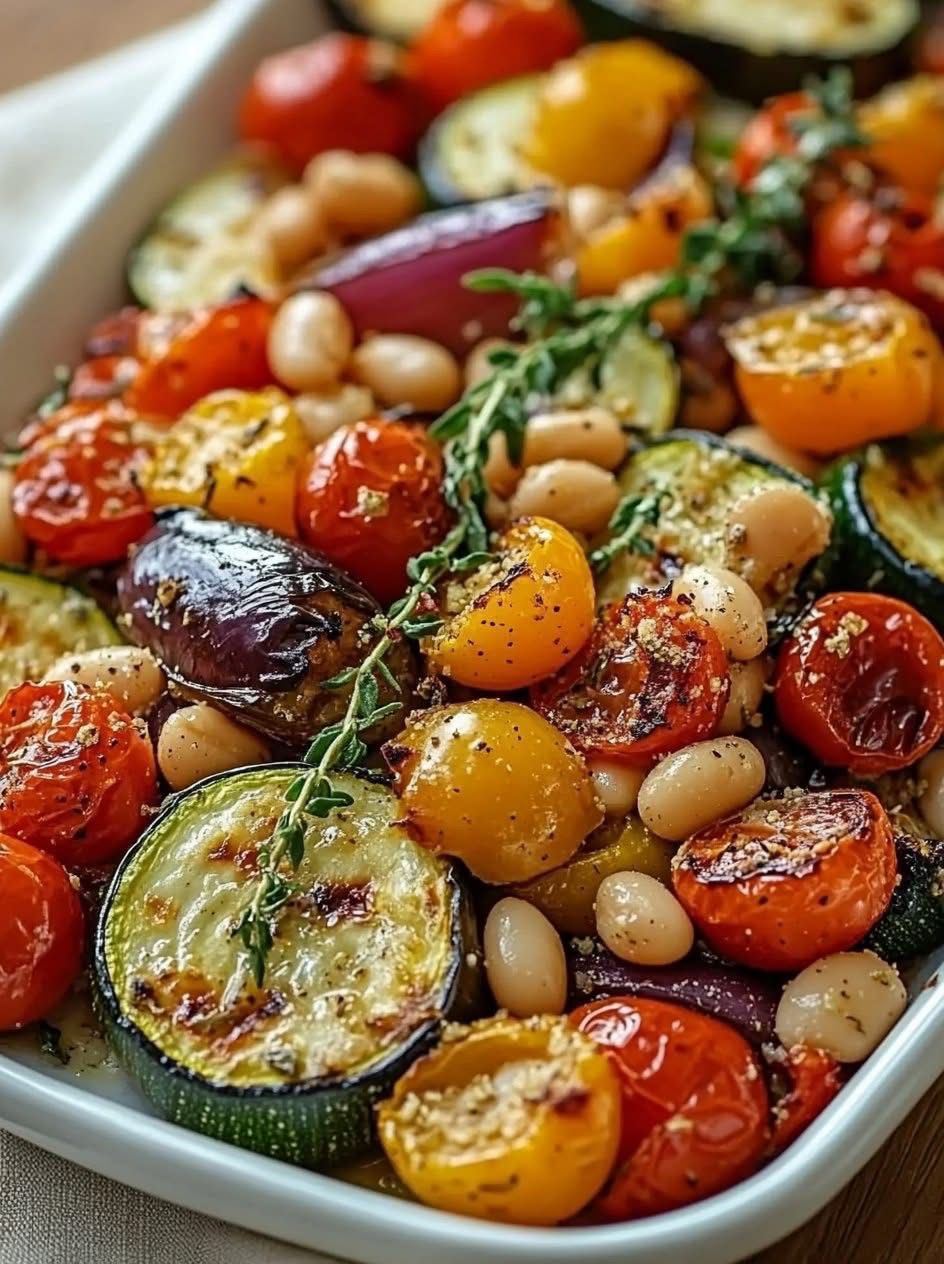 Colorful roasted vegetables, creamy cannellini beans, and a savory Parmesan finish — hearty enough for a main dish, beautiful enough for guests.