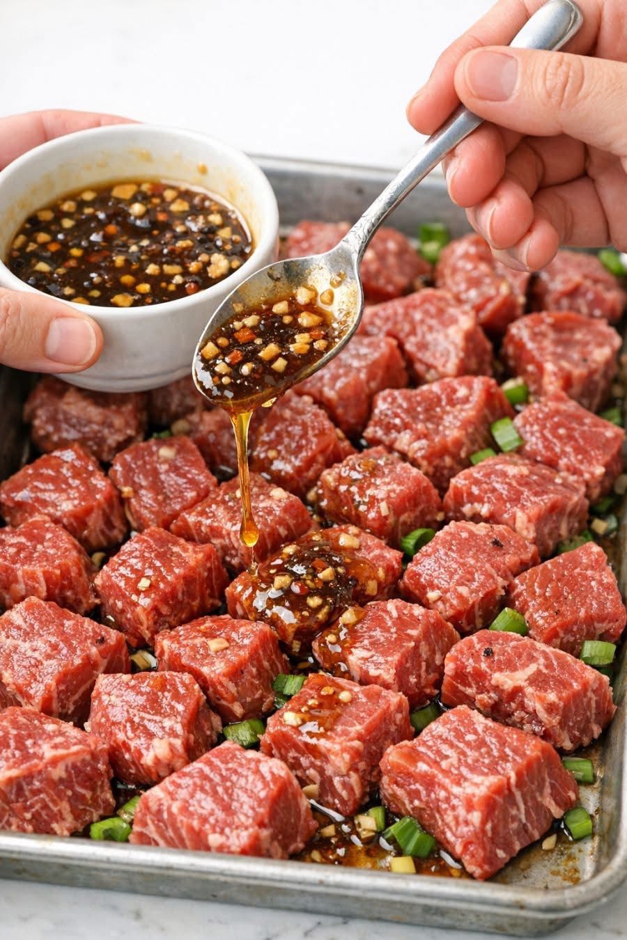 Pour honey garlic sauce over the raw steak cubes. Toss directly on the sheet until evenly coated. Spread into a single layer.