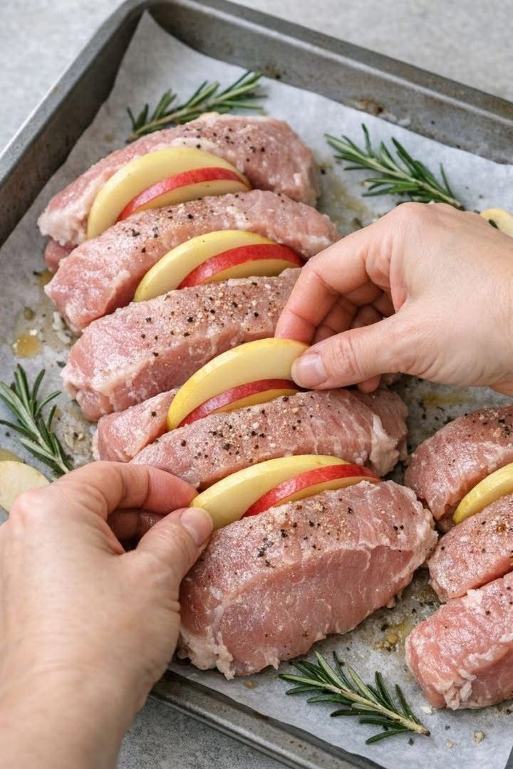 Place pork loin slices on top of the apple and onion layer.