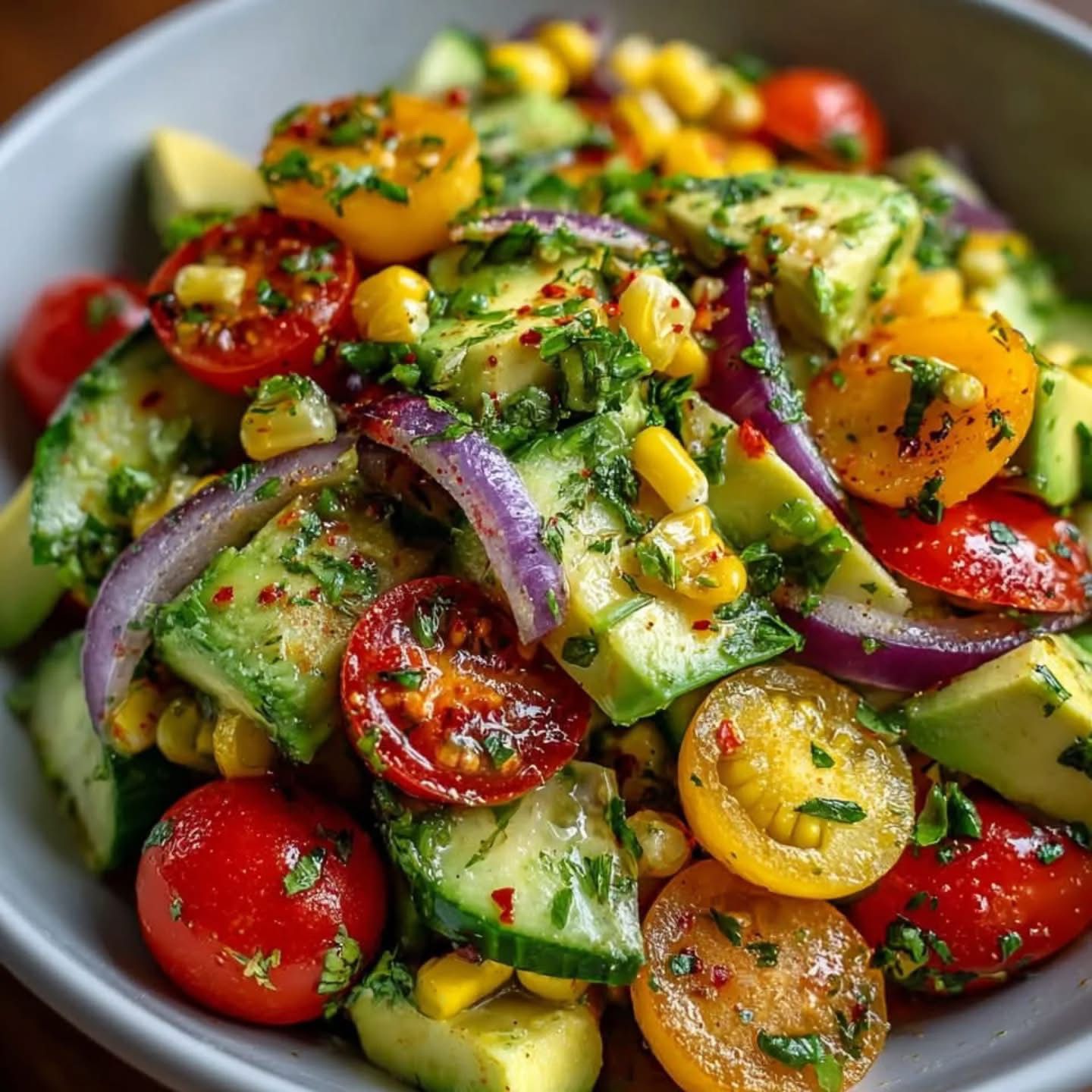 Place the corn kernels, diced avocado, cherry tomatoes, red onion, cucumber, and chopped cilantro in a large mixing bowl.