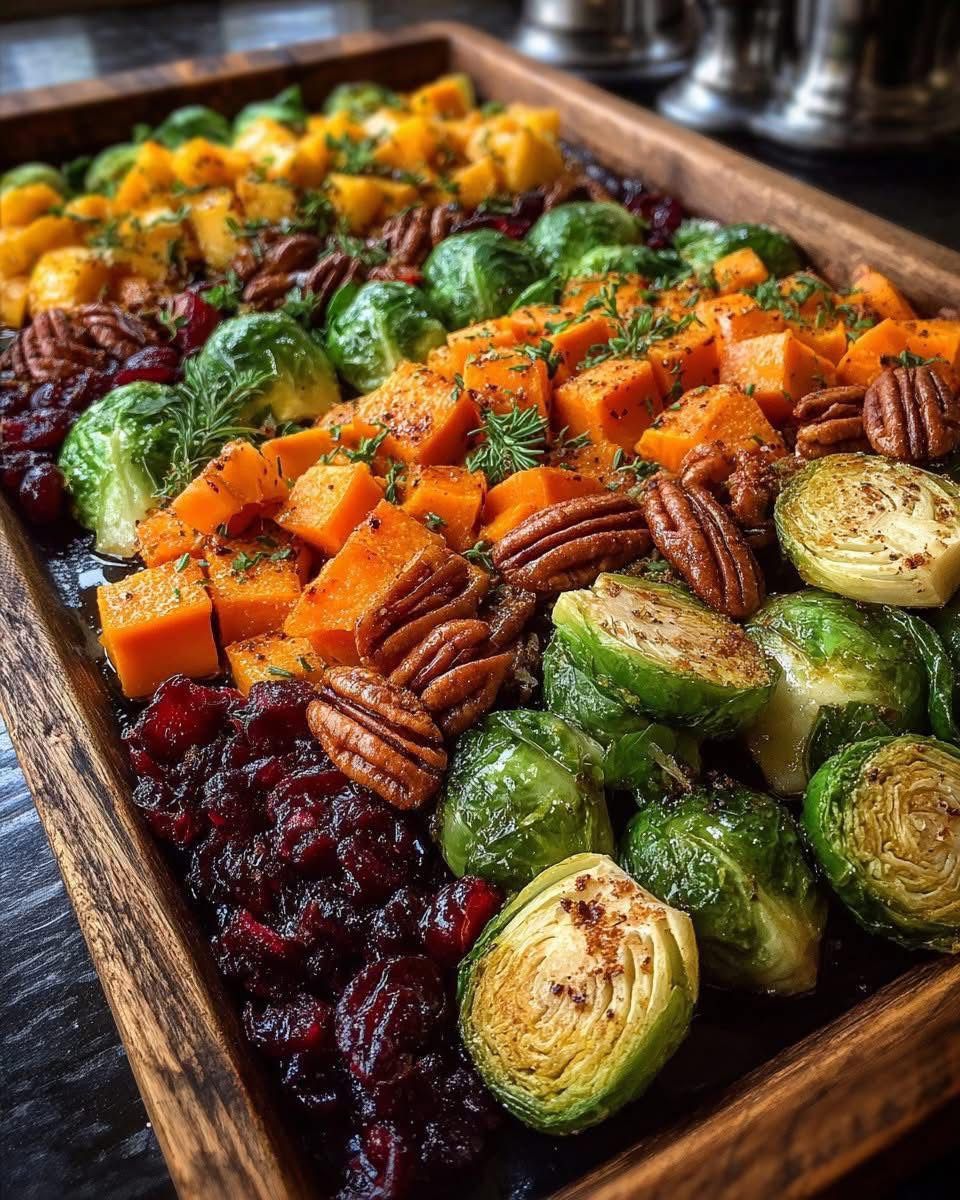 Caramelized Brussels Sprouts & Sweet Potato Sheet Pan with Whipped Ricotta, Cranberries & Maple Pecans