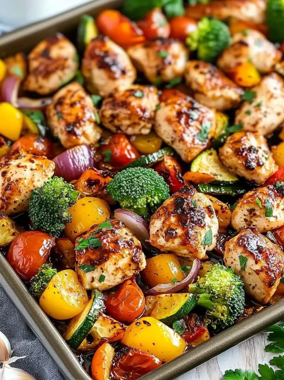 Roast in the oven for 20–25 minutes, stirring halfway through, until the chicken is fully cooked and the vegetables are tender.