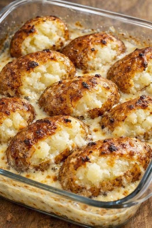 Fluffy baked potatoes loaded with a creamy garlic sauce and topped with melty cheese. It’s indulgent, cozy, and perfect for weeknight dinners or as a hearty side dish.