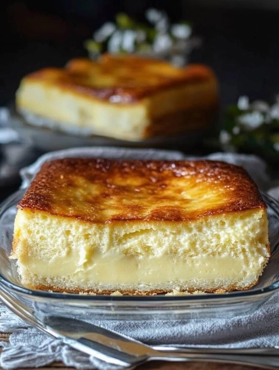 The cake may jiggle slightly in the center when done—that’s the custard layer.